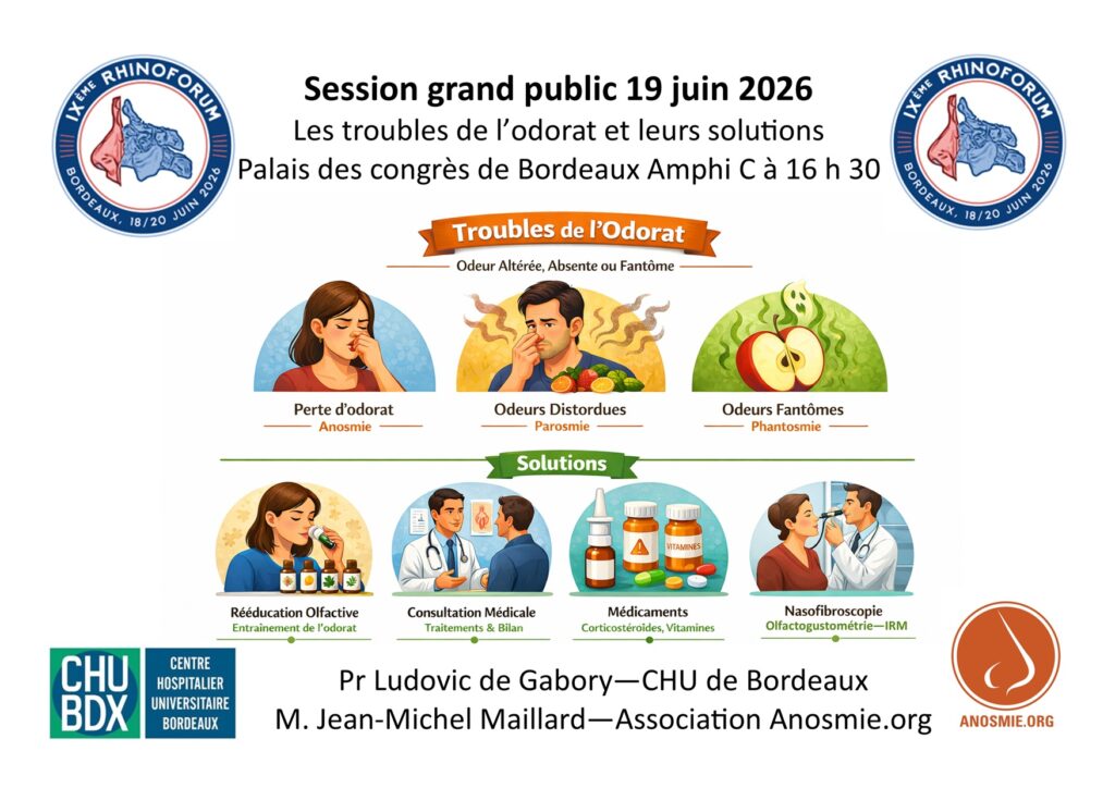 Le service de Rhinologie et de chirurgie des sinus du CHU de Bordeaux organise lors du congrès le Rhinoforum une session grand-public sur les troubles de l’odorat et leurs solutions. Le Pr Ludovic de Gabory, président du congrès, et Monsieur Jean-Michel Maillard président de l’association de patients Anosmie.org souhaitent partager au plus grand nombre les connaissances récentes sur les grandes pathologies qui perturbent plus ou moins durablement l’odorat et le goût et leurs solutions thérapeutiques : des virus aux polypes, le fardeau de l’anosmie et de l’agueusie, les solutions médicamenteuses, chirurgicales et de rééducation seront ouvertes à toutes les questions. Une heure d’échanges est prévue le vendredi 19 juin prochain à 16 h 30 à l’amphi C du palais des congrès de Bordeaux (Tram ligne C arrêt Palais des congrès – en voiture ou vélo Av. Jean Gabriel Domergue, 33300 Bordeaux).